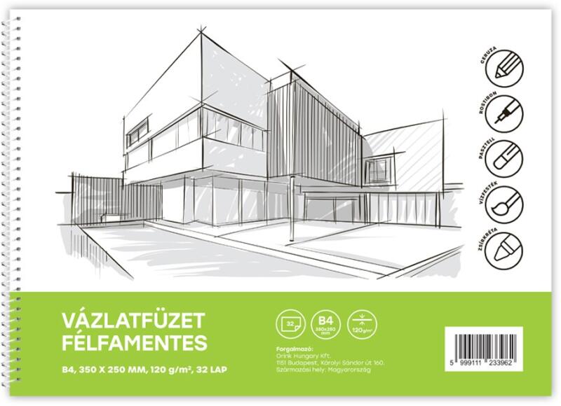 Rajz, festészet és iskolai használatra. Mivel a vázlatfüzet spirálos kialakítású és a lapok egymáson vannak, így vizes festésnél különös figyelmet igényel. 32 lapos