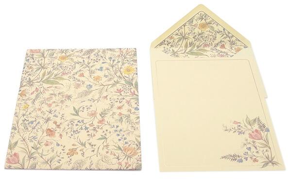 Díszborítékos levélpapír szett tíz krémszínű lap tíz krémszínű bélelt borítékkal tavaszi virágmintával, aranyporral.