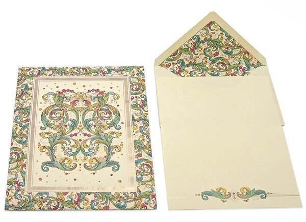 Díszborítékos levélpapír szett tíz krémszínű lap tíz krémszínű bélelt borítékkal barokk mintával, aranyporral.