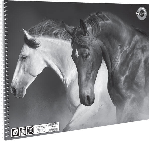 B4-es méretű, spirálos vázlatfüzet fényes fóliázott fekete/fehér borítóval, melyen fekete és fehér vágtázó lovas minta látható. A rajzfüzet 30 lapos. 170 g-os fehér belív. Famentes.
